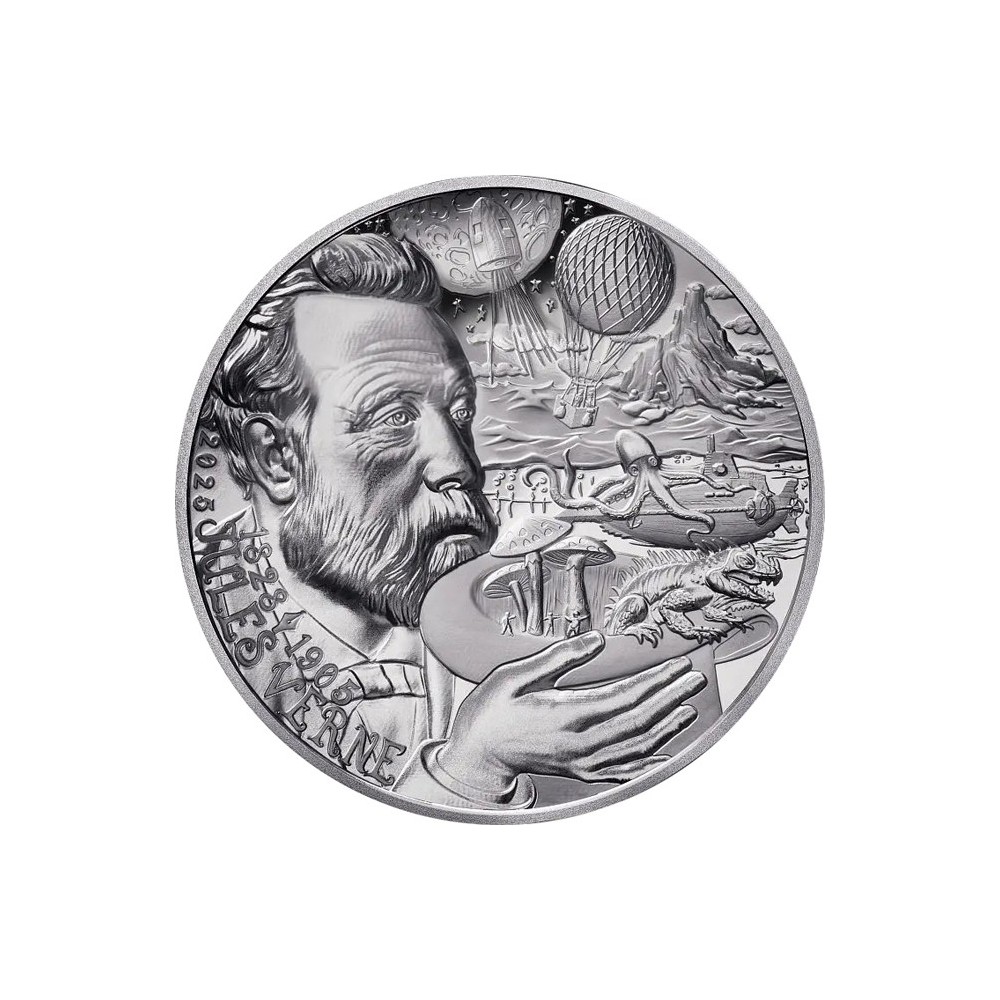 Na přední straně této mince, na níž je vyobrazen Jules Verne a jeho světové dílo, hraje autor roli kouzelníka, který ze svého cylindru odhaluje všechny své vynálezy a představy. Odkazy na knihy Ze Země na Měsíc, Kolem Měsíce, Pět týdnů v balonu, Cesta kolem světa za osmdesát dní, Tajuplný ostrov, Dvacet tisíc mil pod mořem a Cesta do středu Země se prolínají a vytvářejí celkový obraz mimořádných cest. Vlevo od portrétu se nachází jméno autora, data a letopočet.