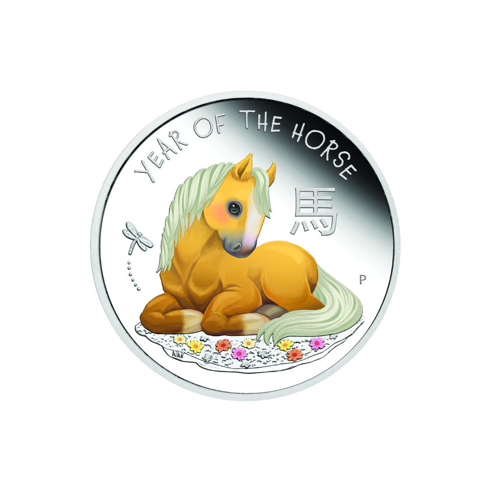 Na rubové straně mince je barevný motiv šťastného hříběte odpočívajícího na trávě zdobené jemnými květy, nad nímž poletuje vážka. Součástí motivu je také čínský znak pro „koně“, nápis „YEAR OF THE HORSE“ (Rok koně) a značka mincovny Perth Mint „P“.