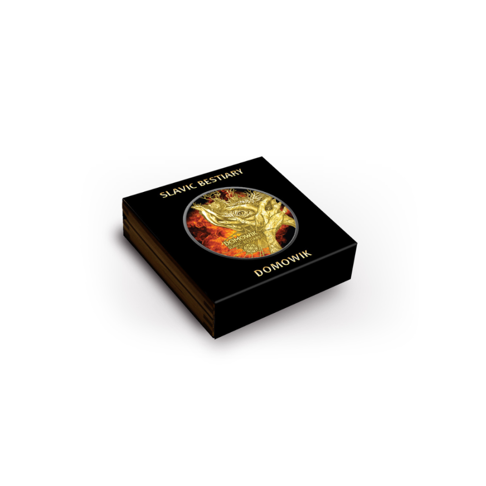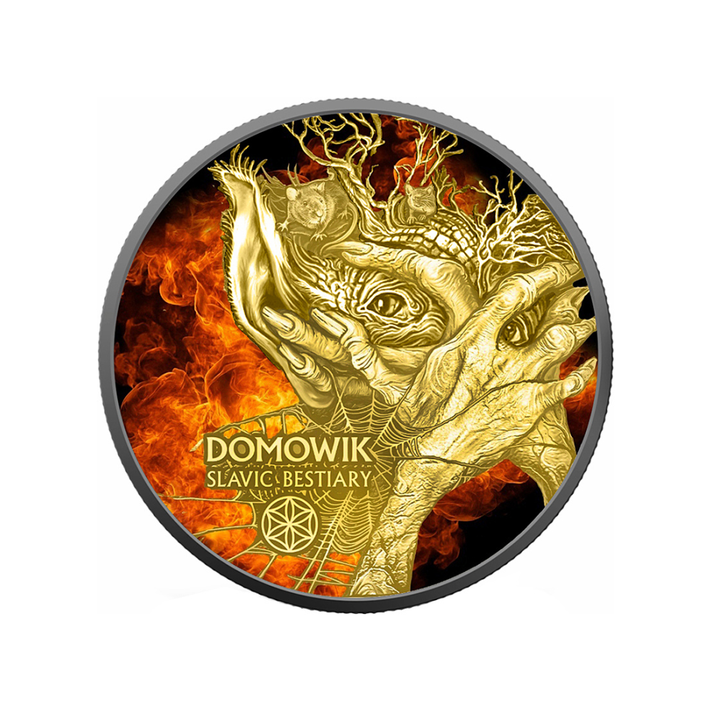 Mince prošla pokovením, jednou z nejexkluzivnějších metod zkrášlení mincí. Líc i rub jsou potaženy černým rutheniem – vzácným přechodným kovem, který vytváří hluboké, tajemné pozadí kompozice. Ústřední postava Domovika je zdobena 24karátovým zlatem, které v kombinaci s motivem ohně dodává designu dramatickou intenzitu a mimořádnou expresivní sílu.