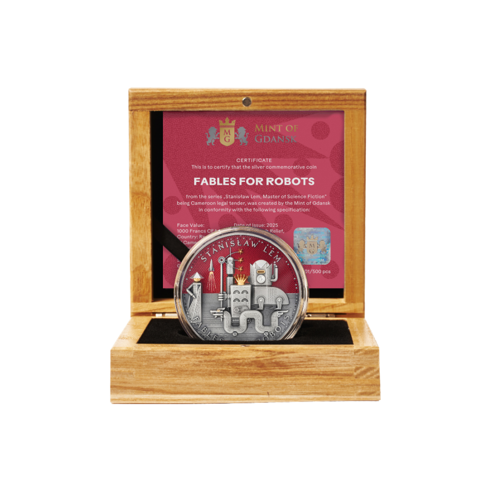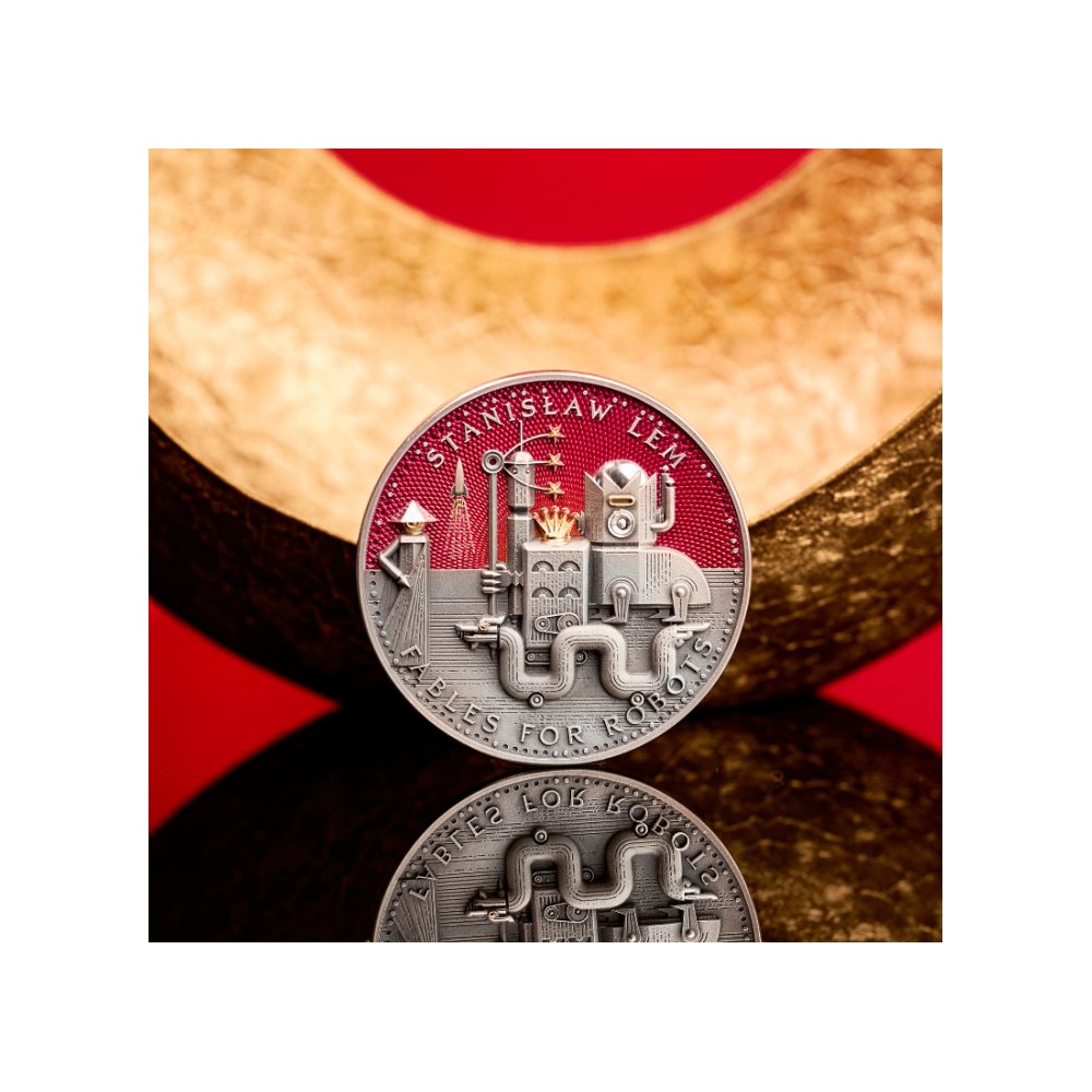 Na rubu mince je vyobrazena fascinující scéna inspirovaná románem Bajky pro roboty, jedním z nejslavnějších děl Stanisława Lema. Motiv znázorňuje fantastické robotické město plné monumentálních mechanických konstrukcí, strážních věží, stylizovaných rukou a tajemných vševidoucích očí, které vytvářejí atmosféru, která je zároveň futuristická i alegorická. Uprostřed se tyčí impozantní robotická postava s korunou, která shlíží na geometrický městský panoramat, zatímco sytě červené pozadí umocňuje dramatický vizuální dojem.