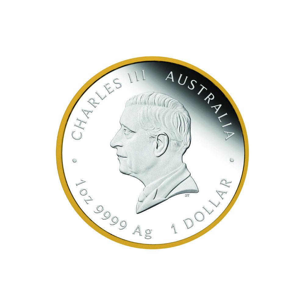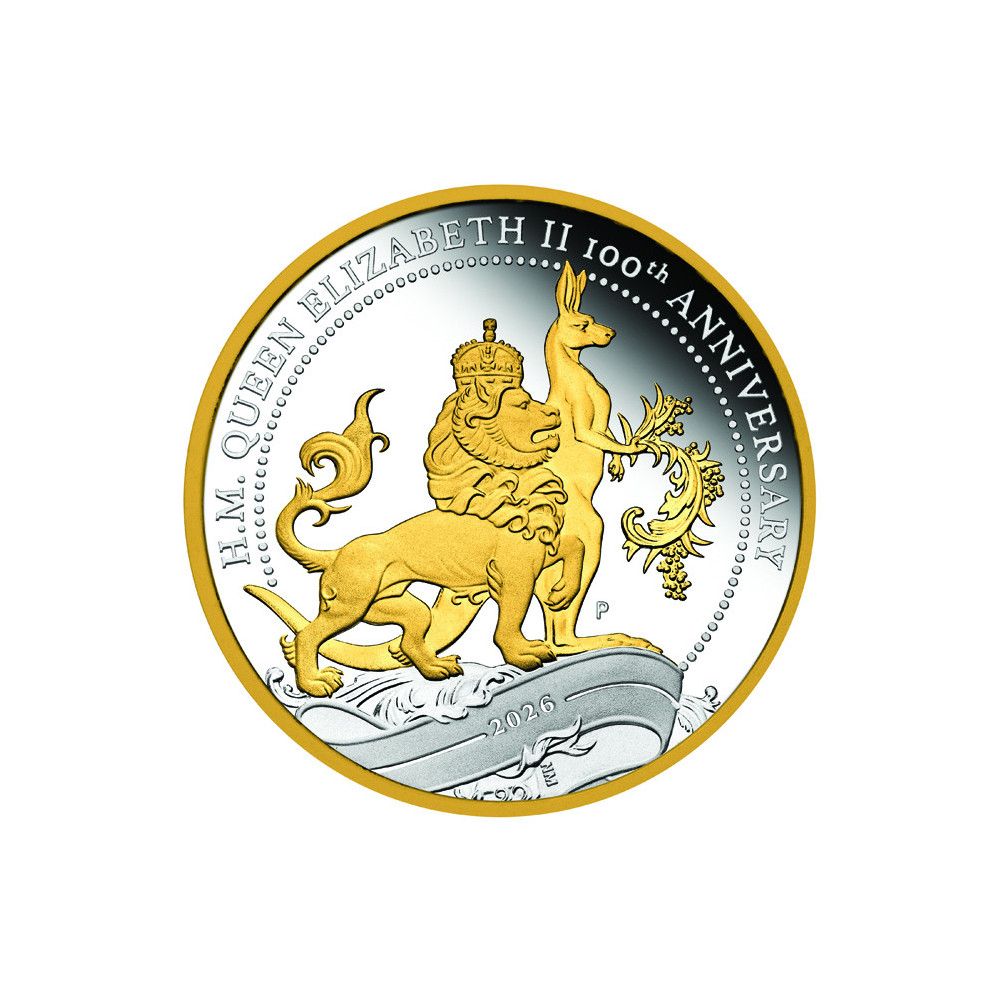 • Pozlacenou minci (celková ražba 3 926 kusů) se stylizovaným pamětním florinem z roku 1954 se lvem a klokanem, oběma zvířaty a okrajem krásně zvýrazněným 24karátovým zlatem.