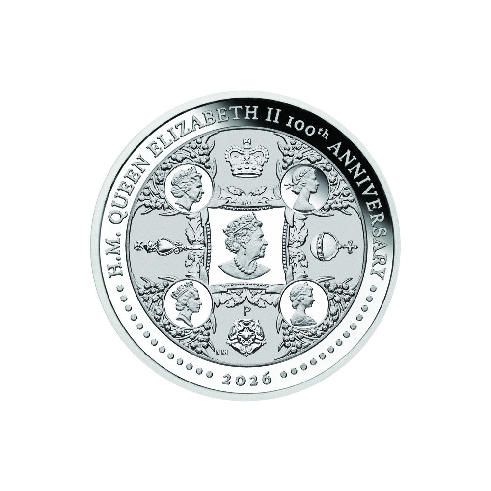 • Stříbrnou minci (celková ražba 7 000 kusů) s pěti podobiznami královny Alžběty II. představujícími různá období její vlády, obklopenými zlatým proutím a královskými regáliemi.