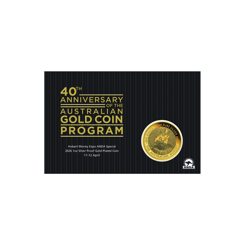 Mince je uložena v černé pruhované prezentační kartě s nápisem „Hobart Money Expo ANDA Special 2026 1oz Silver Proof Gold-Plated Coin 11-12 April“ a logem Australasian Numismatic Dealer’s Association a dala se zakoupit pouze na výstavě v Hobartu.
