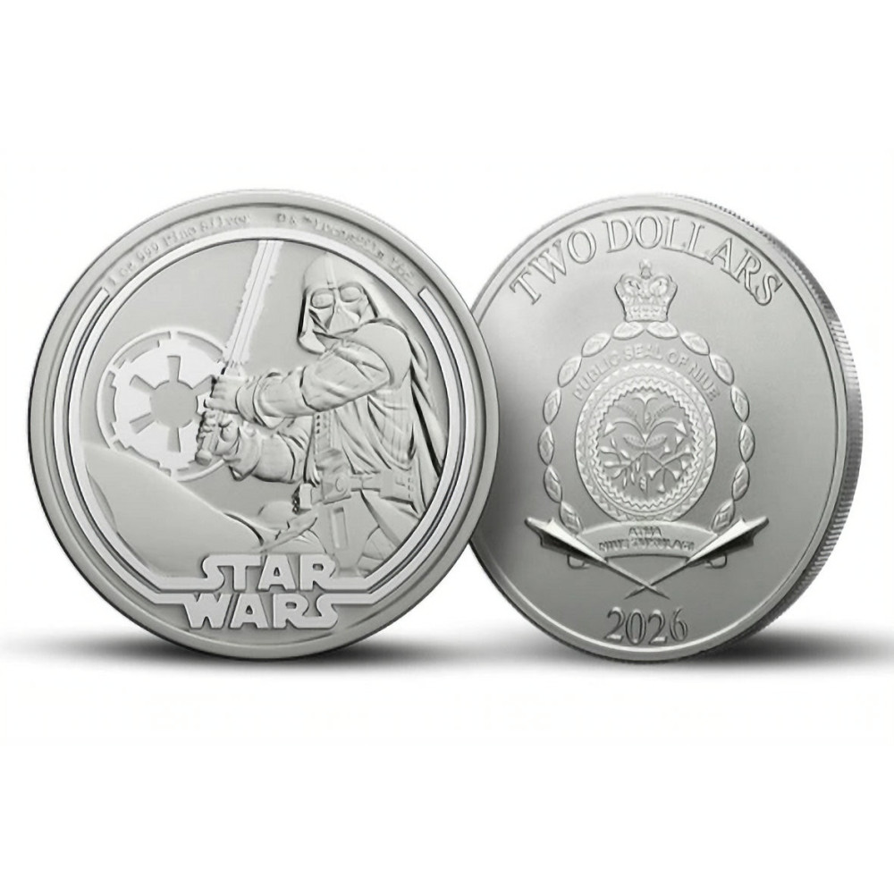 Na rubu stříbrných mince najdete impozantní vyobrazení Darth Vadera, jak drží světelný meč. Vzhled Darth Vadera je mistrovským dílem ikonického designu postavy, kombinujícím černou zbroj, vlající plášť a charakteristickou helmu, čímž vytváří jednu z nejznámějších siluet v celé populární kultuře. Vaderův vzhled, navržený kostýmním výtvarníkem Johnem Mollou a zkonceptualizovaný prostřednictvím legendárního konceptuálního umění Ralpha McQuarrieho, měl vyzařovat absolutní autoritu a mechanickou hrozbu.