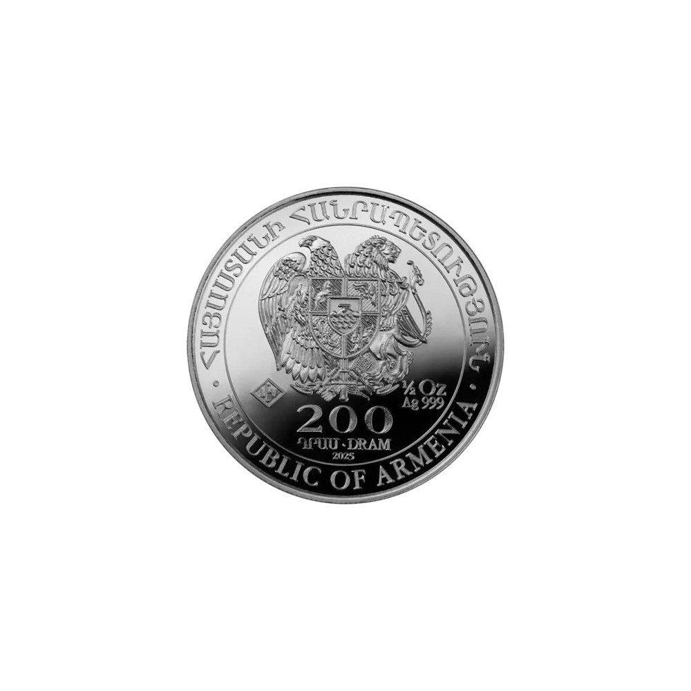 The reverse side of the coin depicts the iconic landing of Noah's Ark at Mount Ararat, which is just a few kilometres away from Armenia. In the foreground is a flying dove with an olive branch in its beak, symbolizing the end of the Flood. The whole scene is again surrounded by an inscription in both English and Armenian.