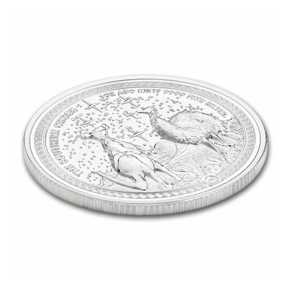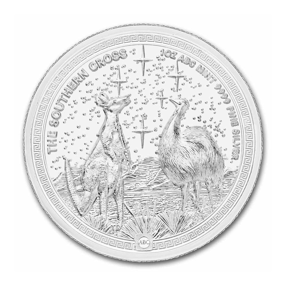 The reverse of the coin depicts a kangaroo and an emu within a meandering border in an Australian outback landscape, both looking towards the constellation of the Southern Cross, which is highlighted in the starry sky. On the grass at the bottom left are the designer's initials, TD, Tony Dean. In the upper left is the inscription THE SOUTHERN CROSS. On the top right is the inscription 1 OZ ABC MINT 9999 FINE SILVER. The pattern on the edge of the coin is interrupted by the ABC mint mark, which looks like a square bar.
