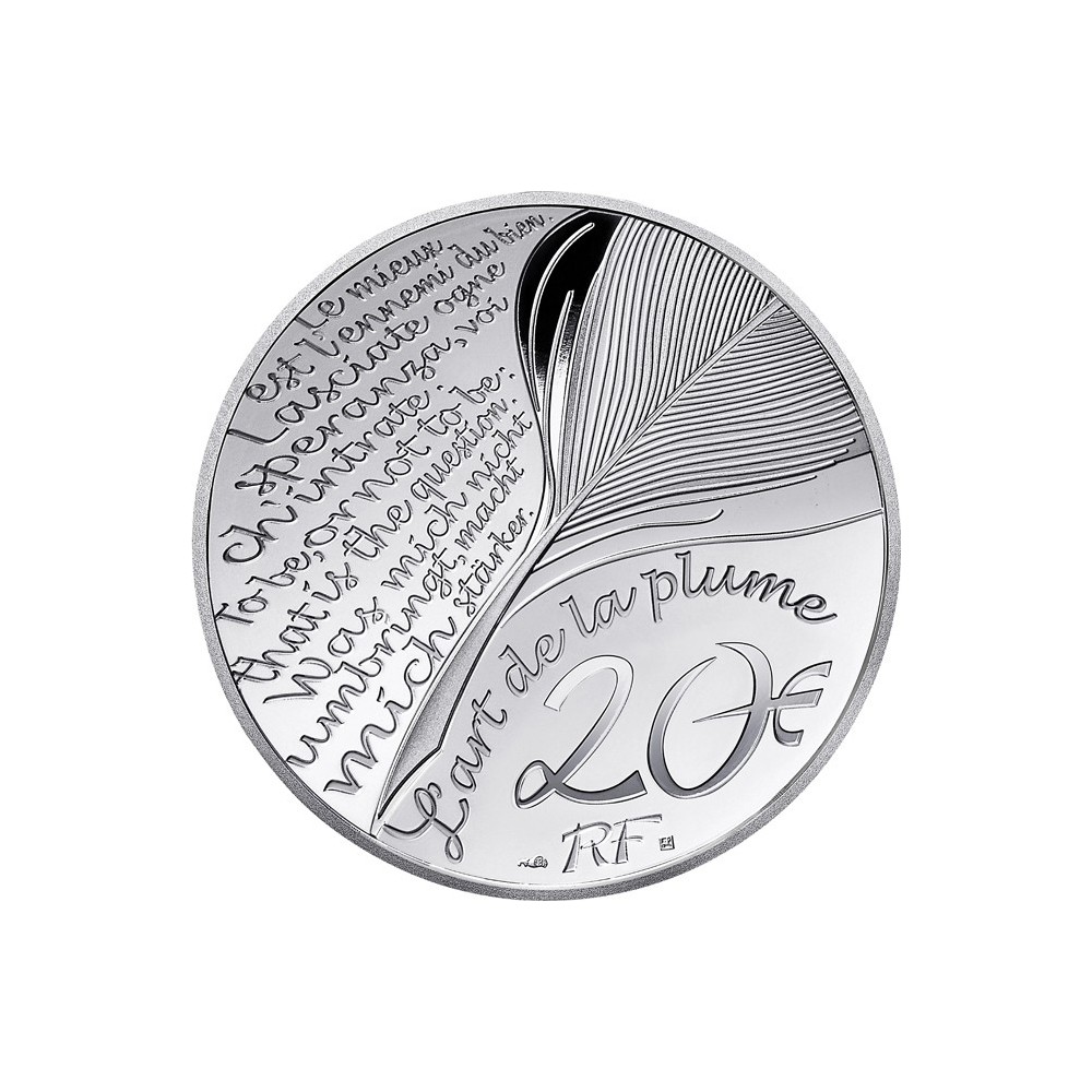 The reverse is common to the entire Art of the Pen series. Several iconic quotes can be read here, including Voltaire's 'Le mieux est l'ennemi du bien', Dante Alighieri's 'Lasciate ogne speranza voi ch'intrate ', William Shakespeare's 'To be or not to be: that is the question' and Nietzsche's 'Was mich nicht umbringt, macht mich starker'. The coin is engraved with a feather in the centre and the name of the series below it. At the bottom of the coin is the abbreviation RF, the hallmark of Joaquin Jimenez and the engraver's workshop.