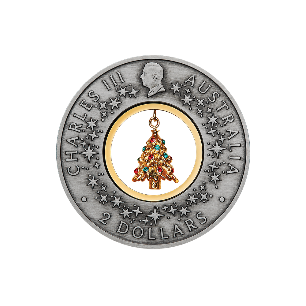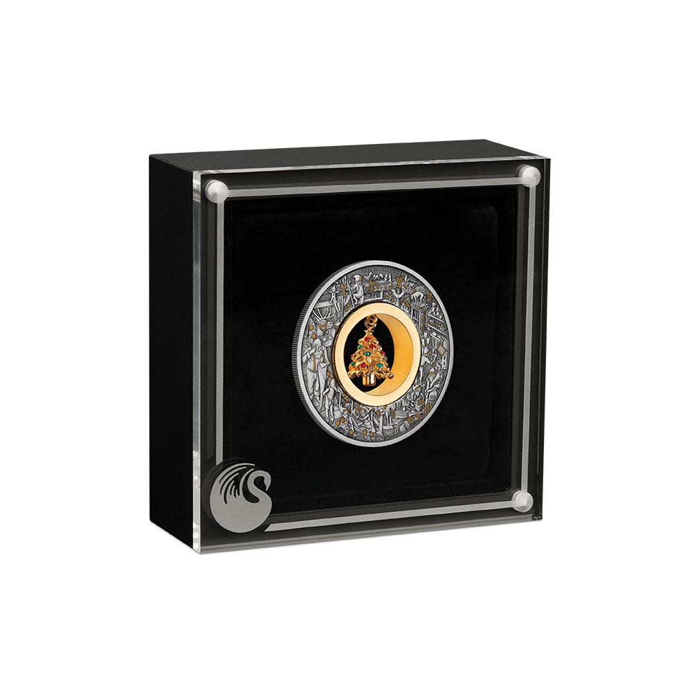 The reverse side of the coin depicts Santa's workshop, full of busy elves preparing Christmas presents. The weight, purity and year 2025 are also shown on the coin, along with the Perth Mint's 'P' mintmark. In the centre of the coin hangs a 24ct gold plated Christmas tree figure with Swarovski crystal decorations. The Christmas tree, a traditional symbol of the Christmas season, represents the changing of the seasons and the time of gift exchange. The Christmas tree, a traditional symbol of the Christmas season, represents the changing of the seasons and the time of exchanging gifts.