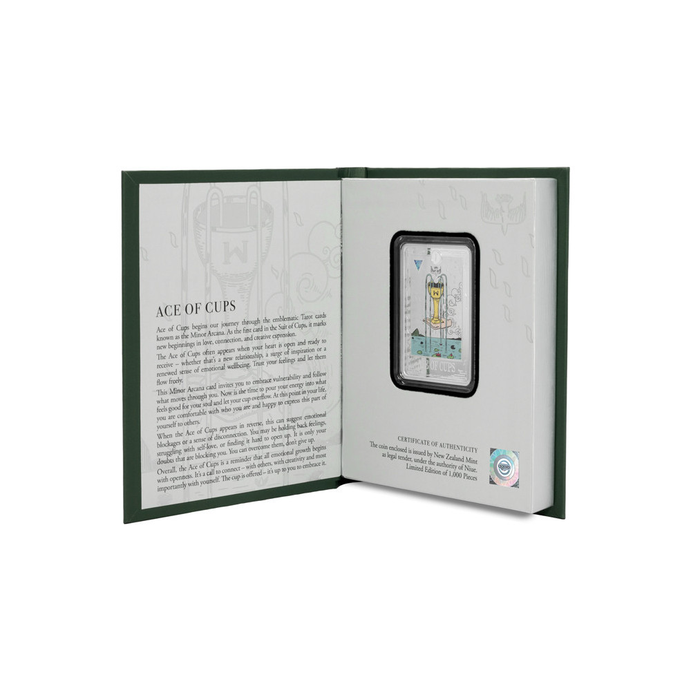 Acs of Cups 1 Oz 2025 COLOR PROOF in the shape of playing cards is the first coin in the New Zealand Mint's Little Arcana Tarot Silver Coin Collector Series.
