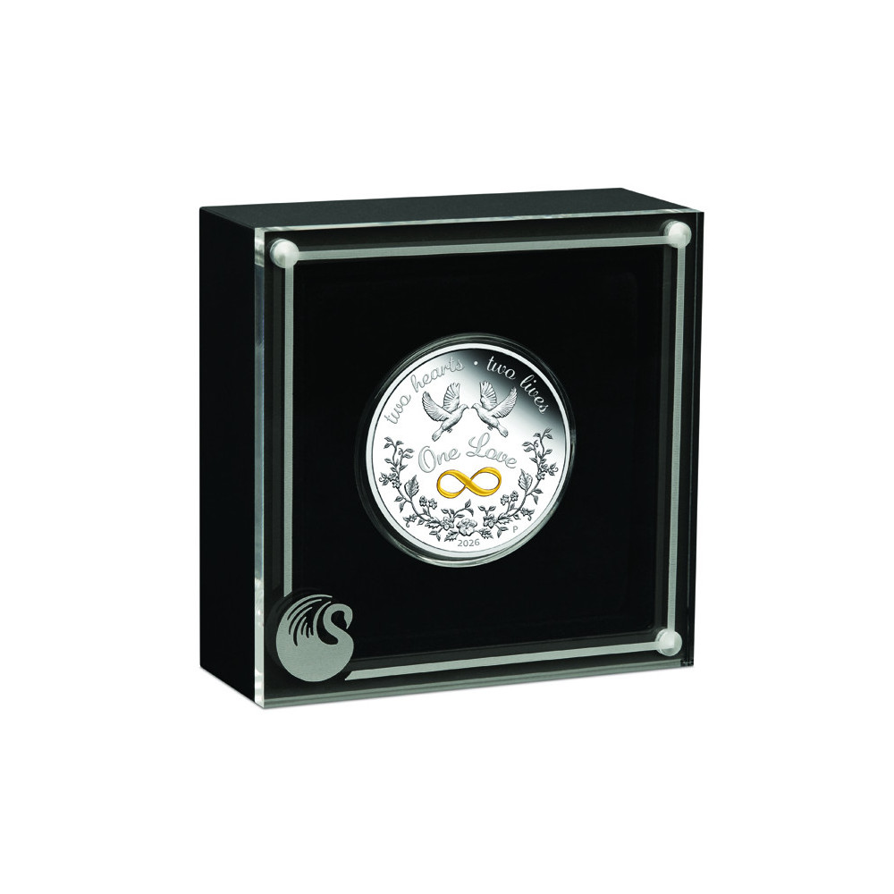 On the reverse of the coin are two pigeons and a colorful infinity symbol and the inscriptions "ONE LOVE", "TWO HEARTS", "TWO LIVES" and the year of mintage - 2026.
