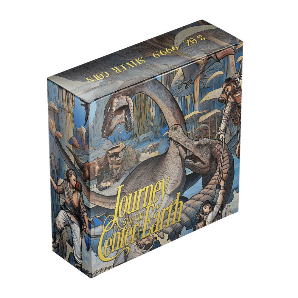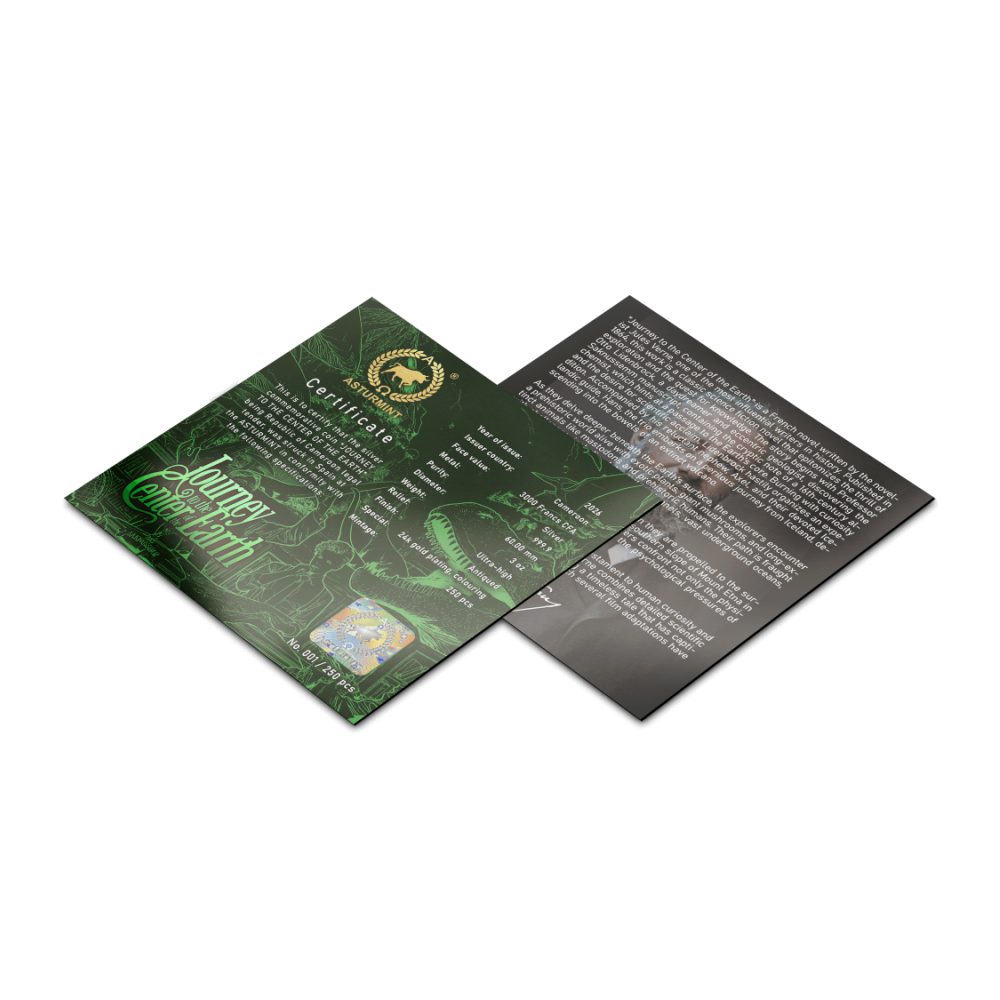 This gorgeous 3-ounce silver coin delves into Jules Verne's novel "Journey to the Center of the Earth". Professor Lidenbrock's feverish ambition pulls Axel through dark veins of fear and wonder. The ancient surface evokes the dust of ancient caves. Ultra-high relief rises like jagged rocks. Selective gilding shines like a spark of discovery. The coin is housed in a case with a certificate of authenticity. There are only 250 pieces in the world.
